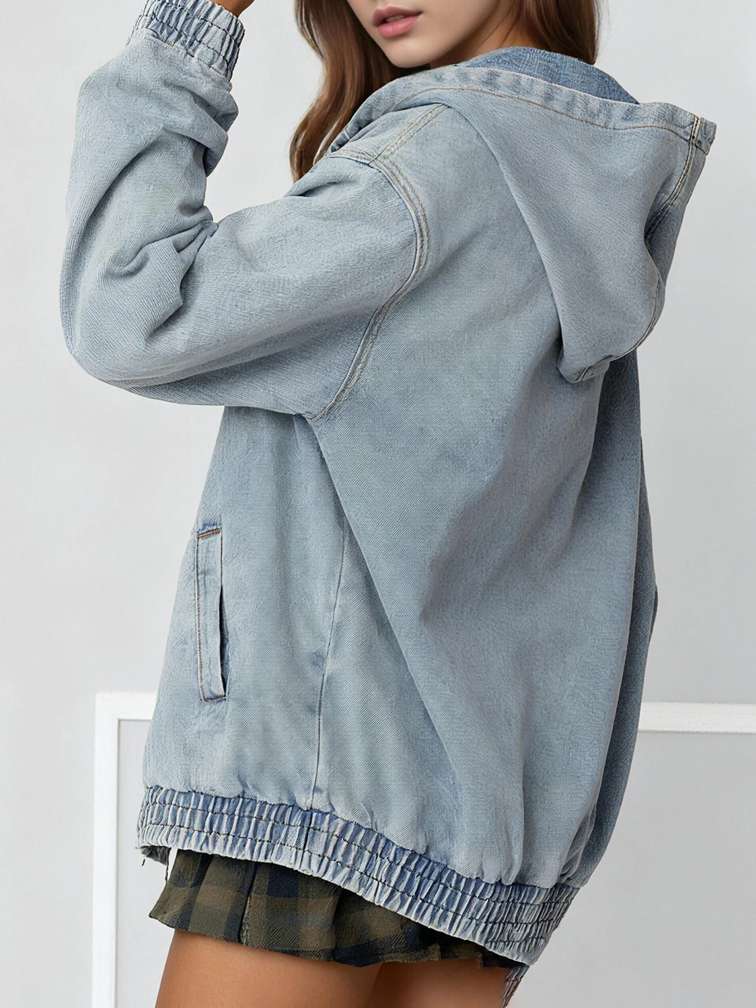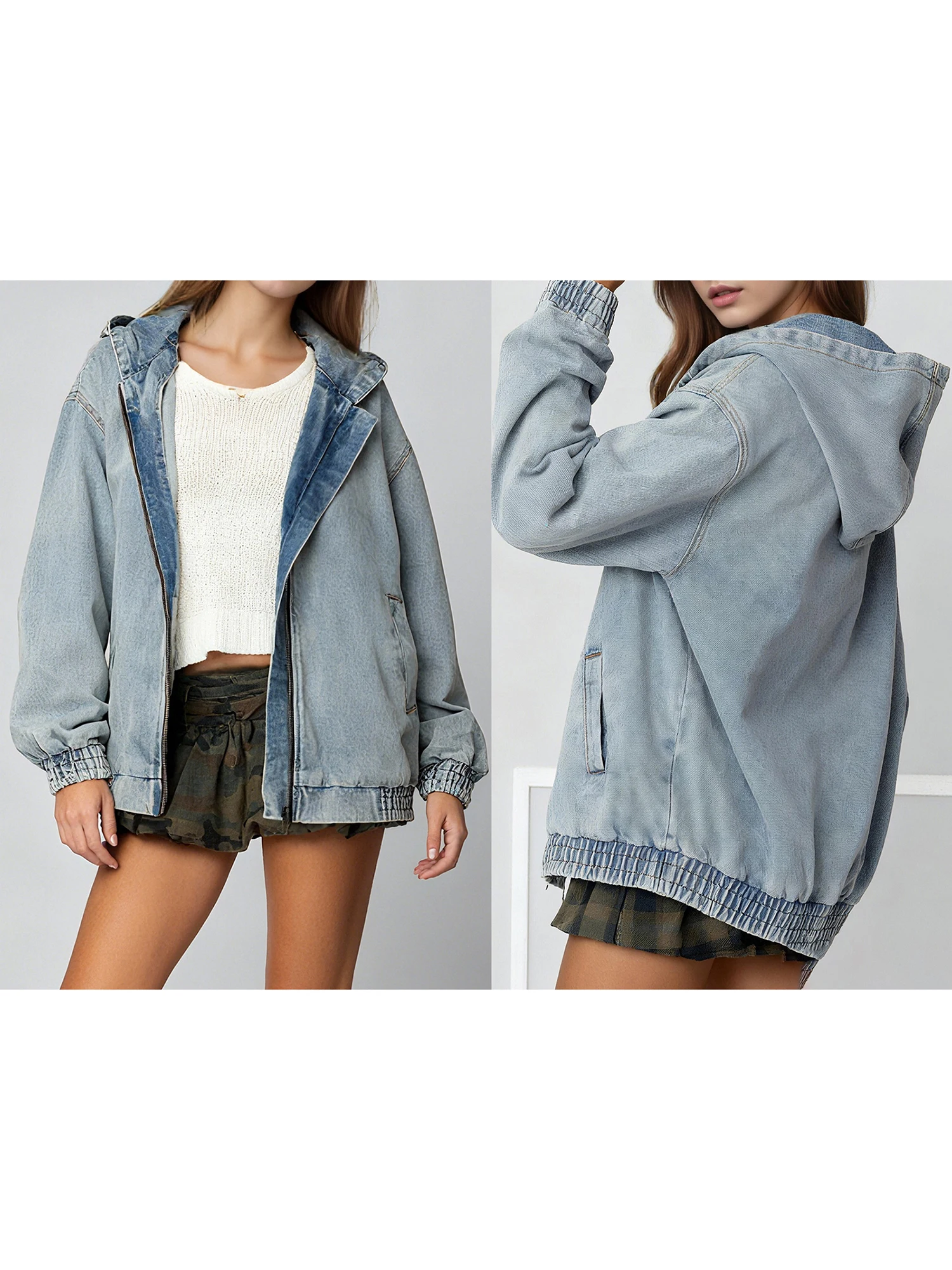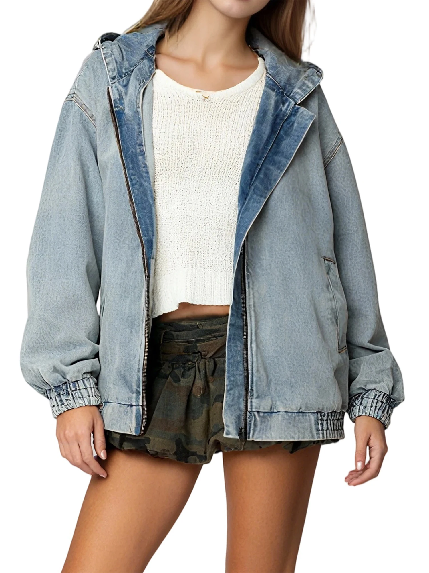 Women Denim Jacket, Long Sleeve Hooded Zipper Closure Fall Jacket Streetwear with Pockets
